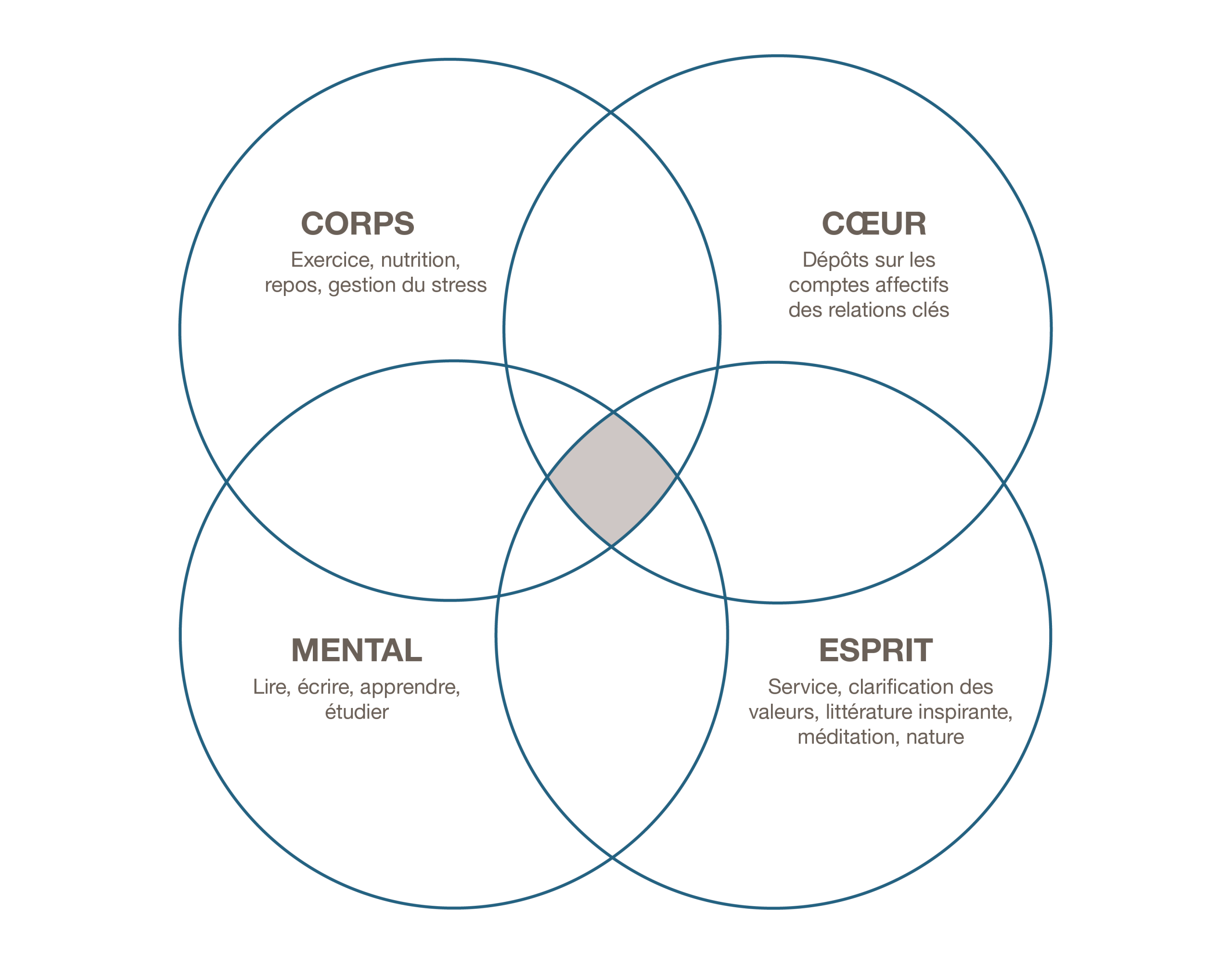 « Aiguisez vos facultés » signifie préserver et améliorer votre plus grand atout : vous-même. Cela signifie avoir un programme équilibré pour vous renouveler dans les quatre domaines de votre vie : physique, social/émotionnel, mental et spirituel.