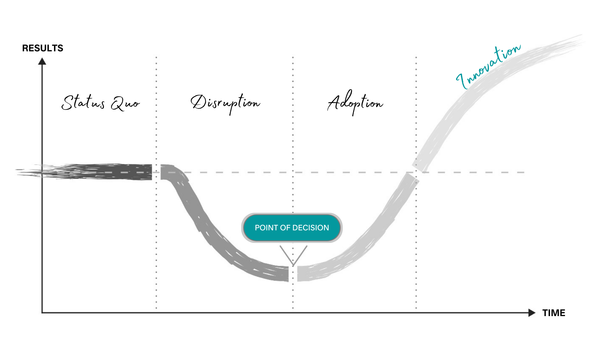 Bien que chaque changement soit unique, il existe un schéma prévisible. Comprendre ce schéma et acquérir les compétences nécessaires pour le gérer avec succès nous permet de déterminer consciemment comment aller de l’avant, même dans les étapes les plus difficiles. La courbe du changement passe par quatre étapes prévisibles :